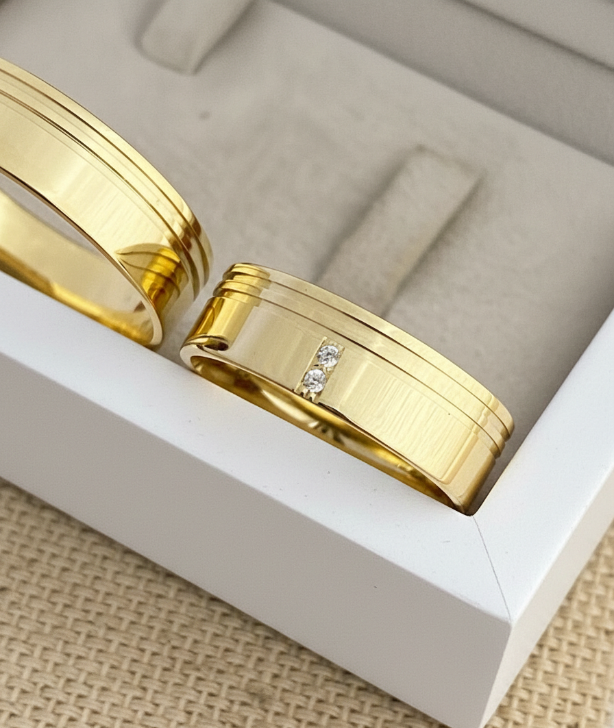 Gravação interna inclusa: um nome + data + símbolo simples (coração, símbolo do infinito, símbolo da cruz e afins) por aliança.